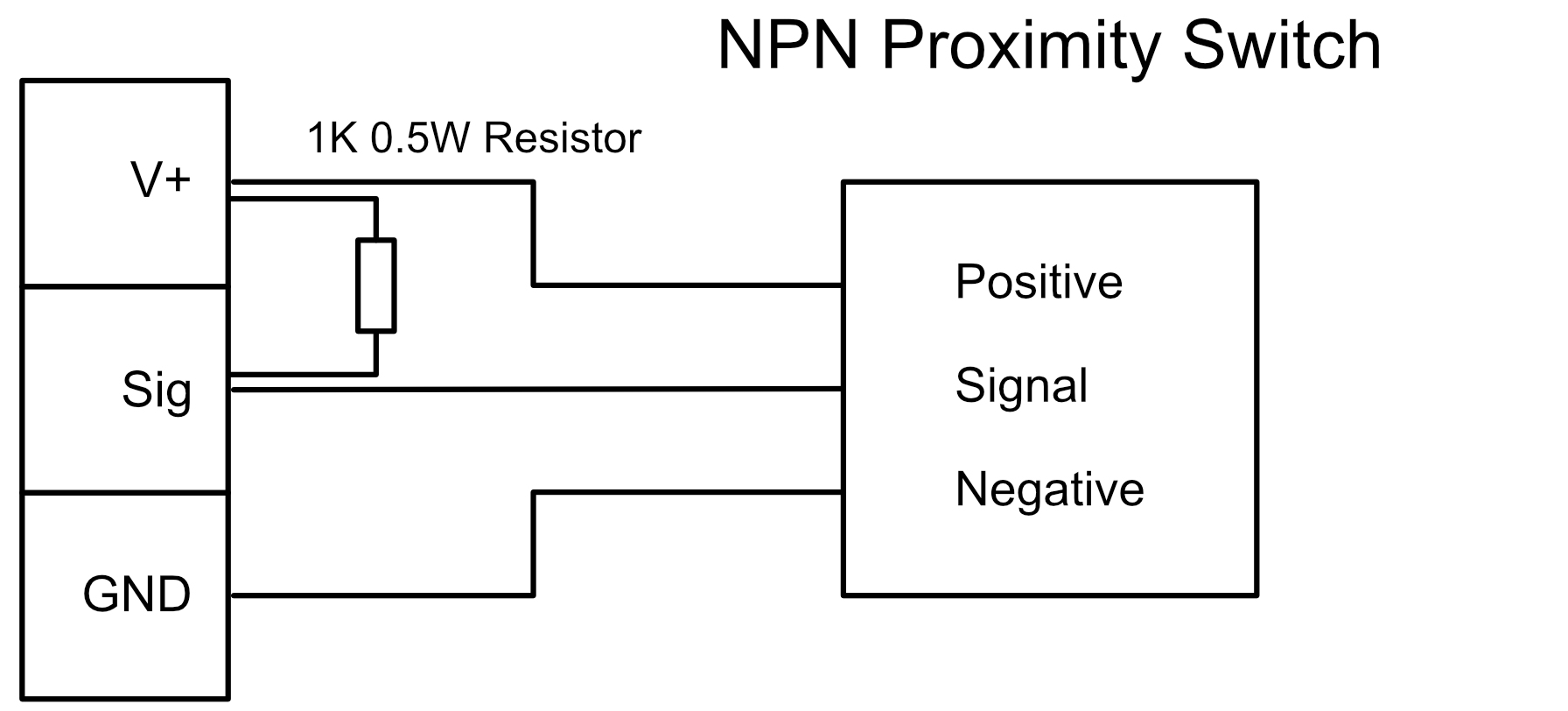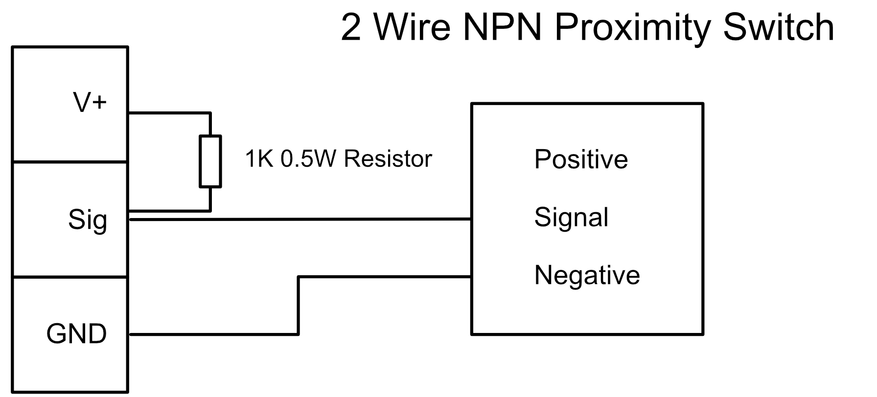 If using a 2 wire proximity switch , a 1k ohm 0.5W pull-up resistor is required between V+ and signal (Sig) on the LC1.